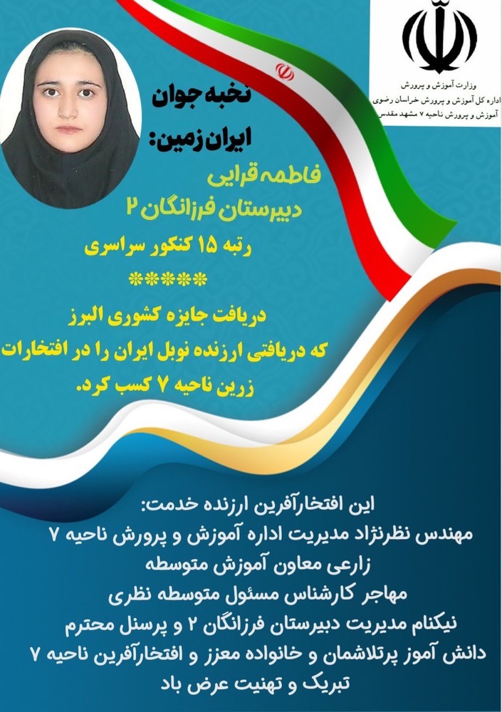 کسب جایزه البرز (نوبل ایران توسط دانش آموز فرهیخته دوازدهم انسانی فاطمه قرائی