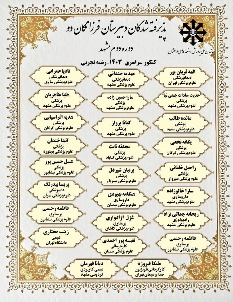 افتخار آفرینان رشته تجربی در کنکور 1403 دبیرستان فرزانگان 2